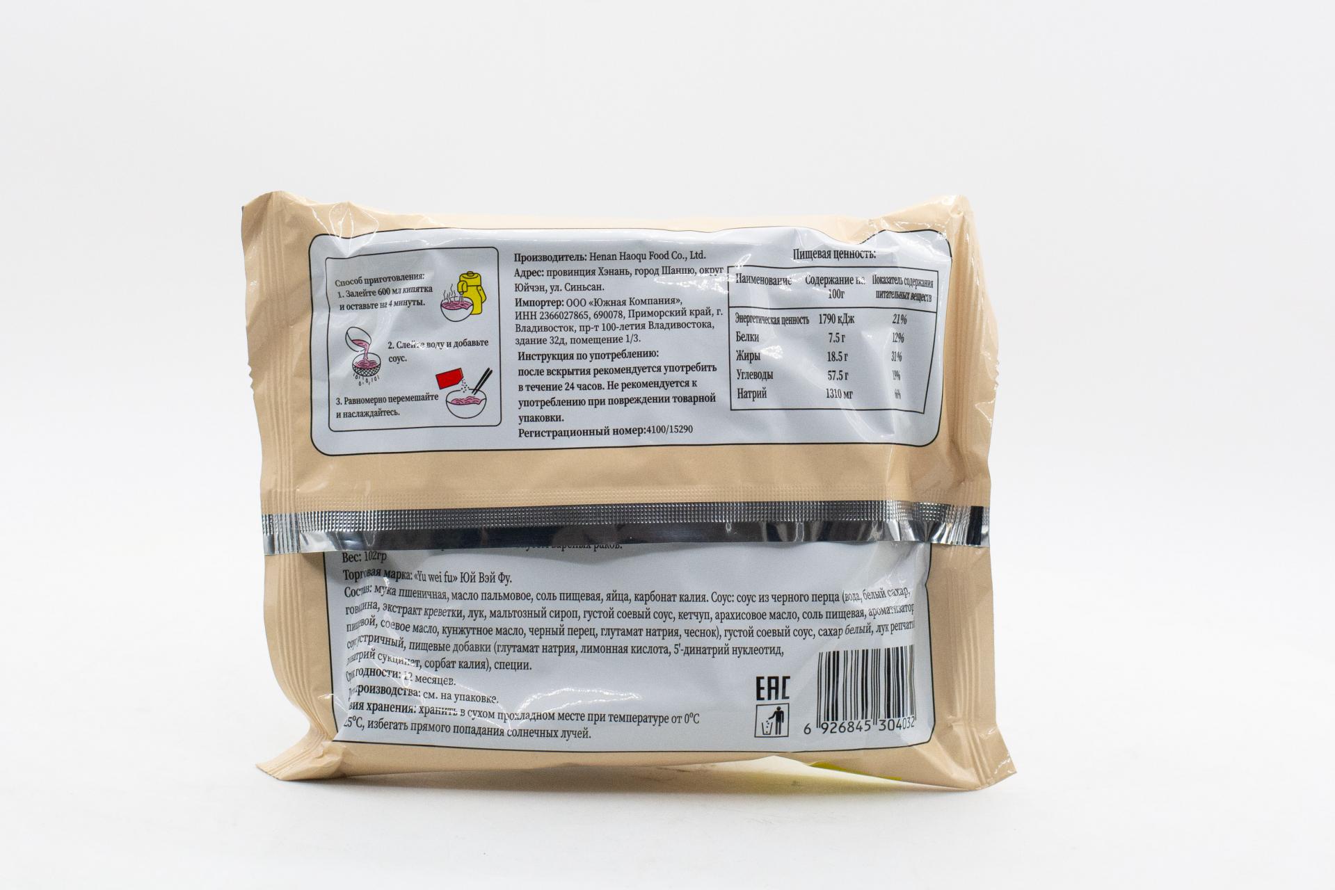 Лапша жареная Юй Вэй Фу со вкусом вареных раков (Китай) 102г47,50 руб. за штуку (в упак. 5 шт.) |